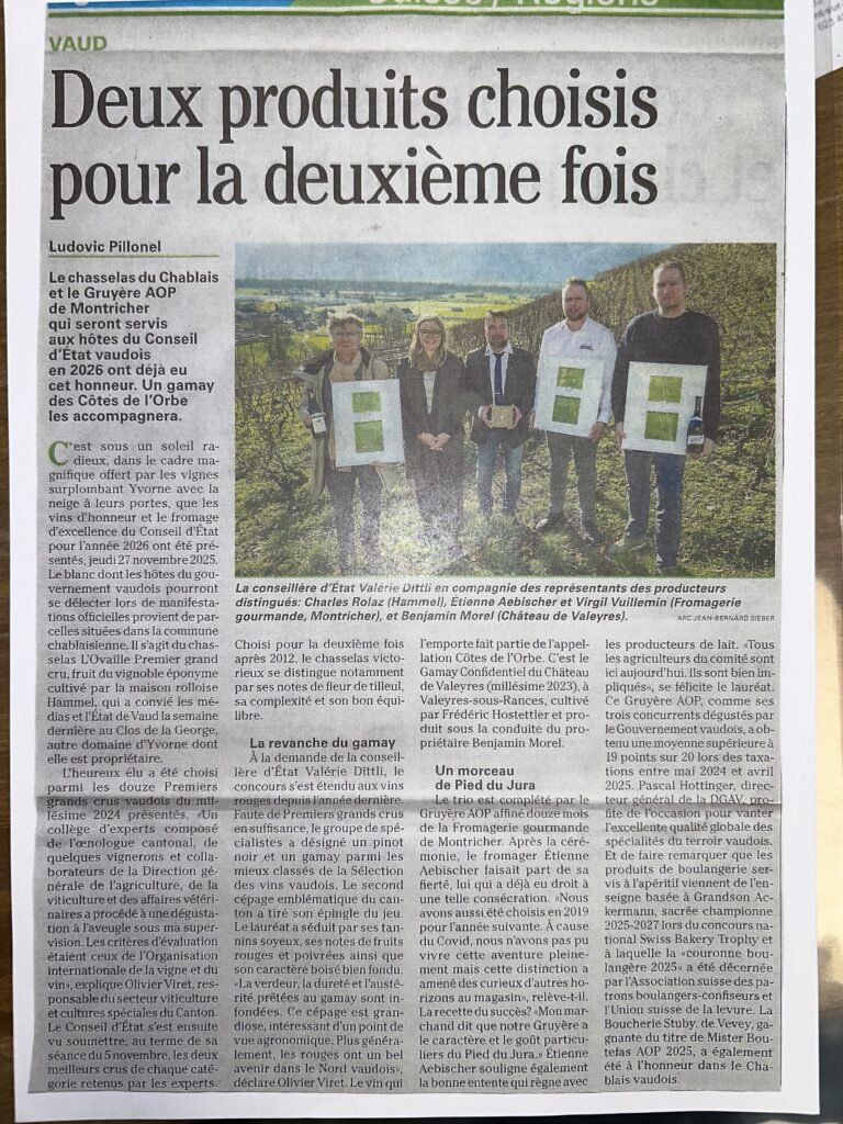 📰 Un Gamay des Côtes de l’Orbe sélectionné pour le Conseil d’État vaudois 2026